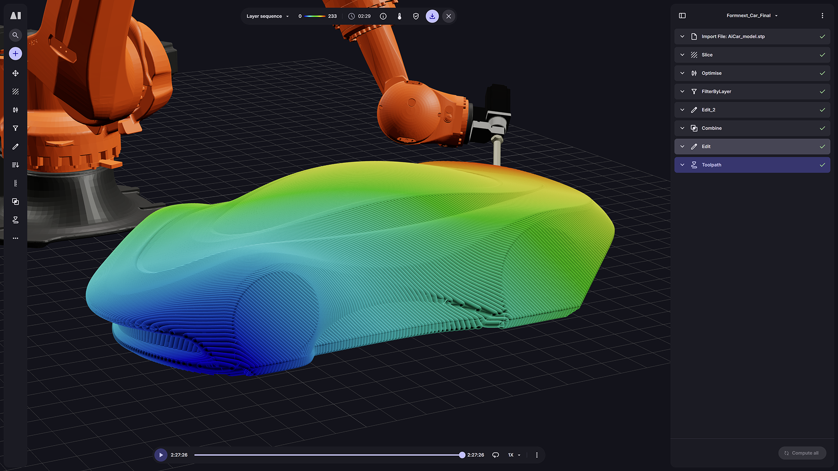 Aibuild’s advanced toolpath strategy solves the complex challenge of hollow angular printing through automatic model analysis with an advanced angle predictor that determines optimal printing planes for overhangs. The software’s revolutionary single wall construction dramatically reduces material usage while its adaptive layer management creates a sophisticated zig-zag sorting pattern that eliminates layer-to-layer jumps entirely. Unlike traditional 3D printing software that requires constant jumps between disconnected sections, Aibuild’s continuous back-and-forth motion transforms fragmented printing into smooth, uninterrupted production that enables the shift from weeks of traditional prototyping to hours of automated manufacturing.